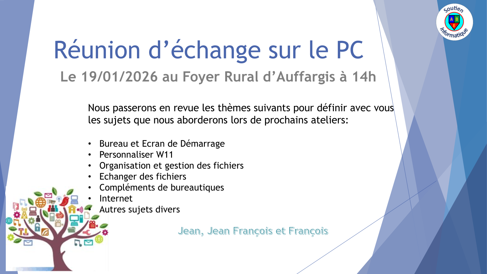 PC réunion d'échange 14:00 – 16:0019 janvier 2026 Foyer rural27 rue des Vaux-de-CernayAuffargis, 78610FranceView LocationCarte Foyer rural iCal Calendrier Google Voir le calendrier complet